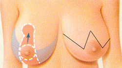 The plan for the operation starts with selecting the height for the new nipple position and deciding how much of the upper breast skin needs to be saved. The gray area on each side of the nipple gets removed. The arrow indicates how the nipple will move upward.